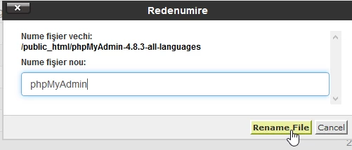 - v novém adresáři se objeví název příslušného archivu, ale bez přípony .zip, uvnitř adresáře public_html. Tento adresář je potřeba přejmenovat tak, aby zůstal pouze "phpMyAdmin". Přejmenování se provádí výběrem příslušného adresáře a stisknutím tlačítka "Přejmenovat" v liště nahoře na stránce.