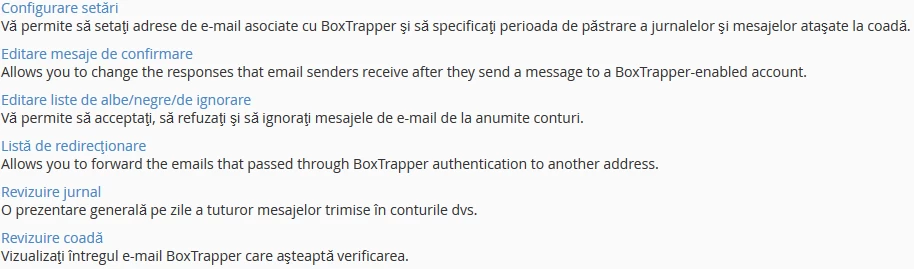 - BoxTrapper je nástroj, který umožňuje blokovat příjem jakéhokoli e-mailu, jehož odesílatel nebyl předtím zahrnut na seznam povolených adres držitele účtu. Působí jako e-mailový filtr, který umožňuje zprávám od nových odesílatelů vstoupit do doručené pošty příjemce pouze po přidání jejich e-mailové adresy jako známé adresy. Tímto způsobem můžeme vytvořit filtr, který umožňuje přijímat e-maily pouze z korespondenčních adres, které si přejeme, čímž se vyhneme kontaktu s neznámými odesílateli nebo spamovými zprávami.