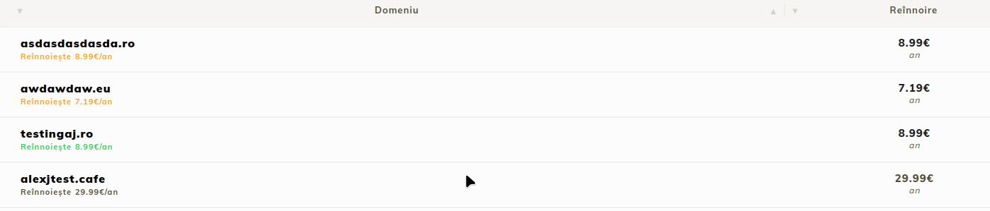 - Zobrazí se vám domény, které vlastníte na Hostico. Můžete vidět název, stav, zbývající aktivní období a náklady na obnovení.