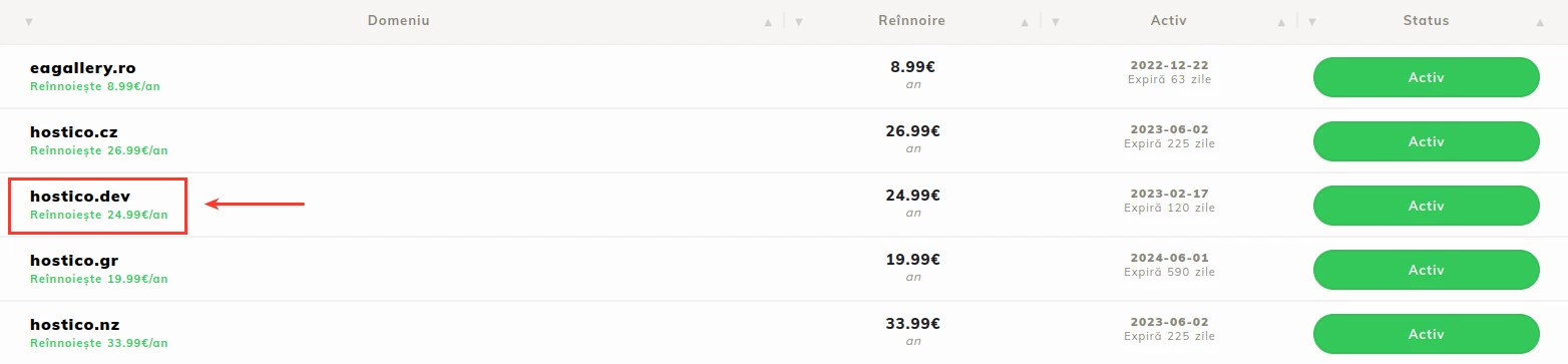 V nabídce s prezentací aktivních domén v klientském účtu klikneme na doménu, pro kterou chceme požádat o autorizační klíč (EPP);
