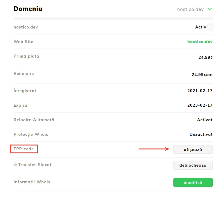 - Před použitím EPP kódu k převodu domény se ujistěte, že doména nemá zaškrtnuté jednu nebo více ochranných možností, jako například: Ochrana proti krádeži (Ochrana proti krádeži / Zámek domény / Zámek registrátora) a WHOIS / ID ochrana.
