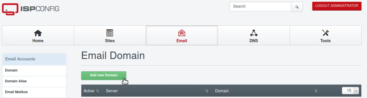 - ISPConfig nabízí možnost vytvářet e-mailové schránky spojené s vlastněnými doménami. Aby bylo možné vytvořit e-mailové schránky, bude nejprve nutné přidat doménu do panelu, v menu Doména pod kategorií E-mailové účty.