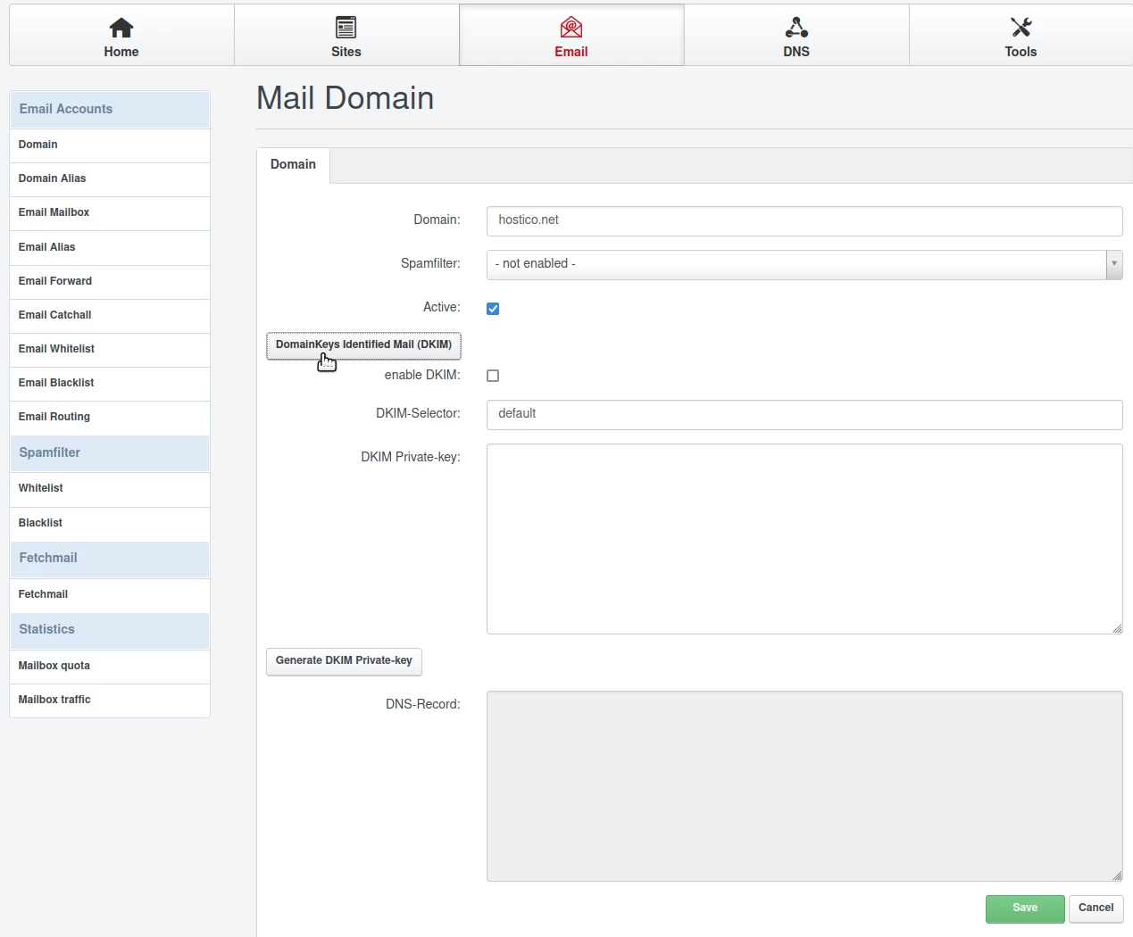 - Aktivní: Necháme zaškrtnuté políčko; Pokud chceme také nastavit DKIM (ochrana proti spamu/fishingu), klikneme na tlačítko DomainKeys Identified Mail (DKIM); Doporučuje se projít i tímto krokem;