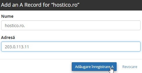 - V poli Název přidáme doménu, pro kterou přidáváme A záznam (hostico.ro) a v poli Adresa přidáme IP adresu IP (IPv4) serveru, který hostuje doménu 203.0.113.11.
