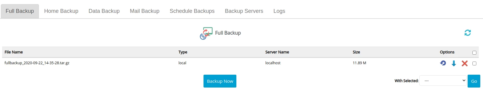 - Zde můžeme smazat, obnovit a stáhnout archiv, který obsahuje zálohu.
